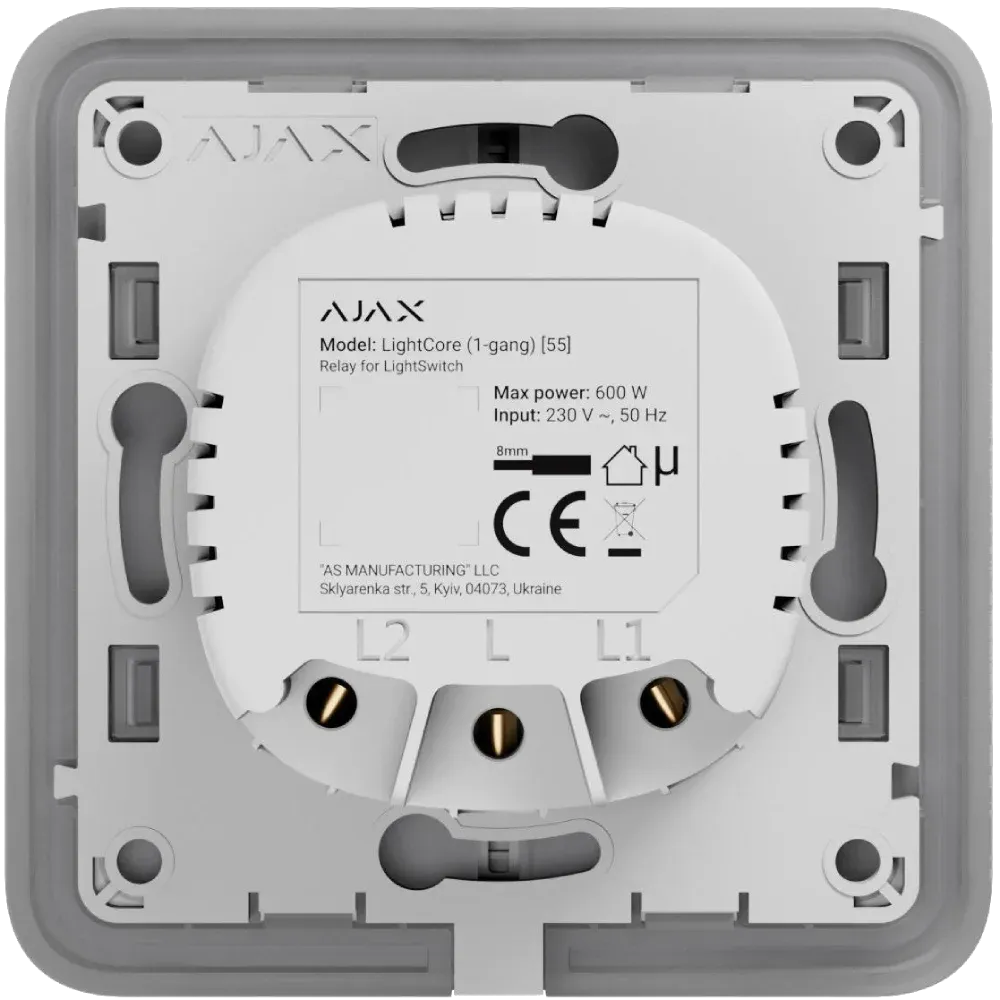 LightSwitch потребує лише фази живлення для роботи. На сенсорну панель не обовʼязково натискати. LightSwitch спрацьовує в разі наближення руки на відстань 15 мм. Підсвічування вночі опційне, можна вимкнути в налаштуваннях пристрою в застосунку Ajax. Спрацьовує на освітлювальні прилади недостатньої потужності (до 5 Вт). У разі спрацювання захисту LightSwitch вимикає живлення та відправляє сповіщення в застосунки Ajax. Для освітлювальних приладів низької потужності в комплекті є конденсатор.